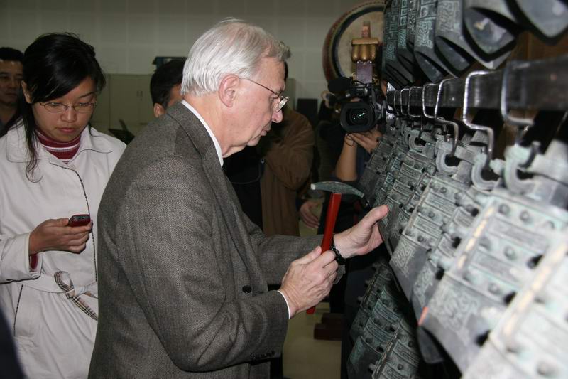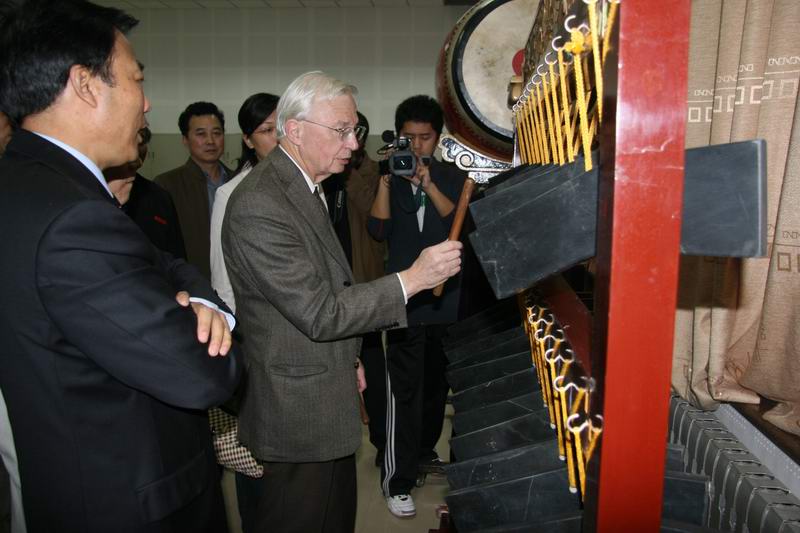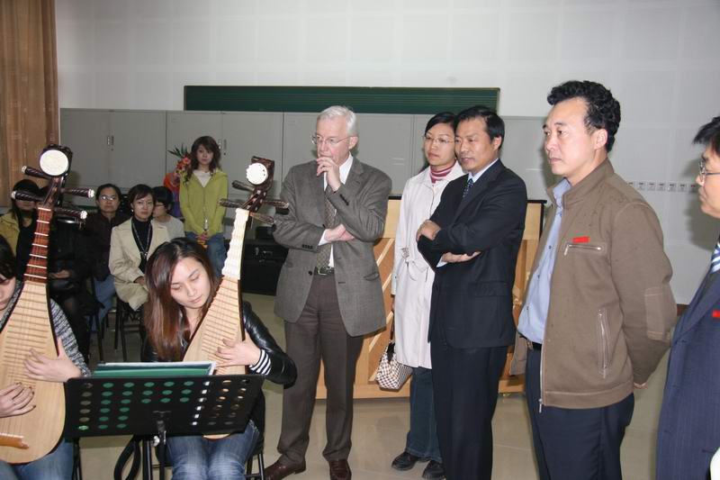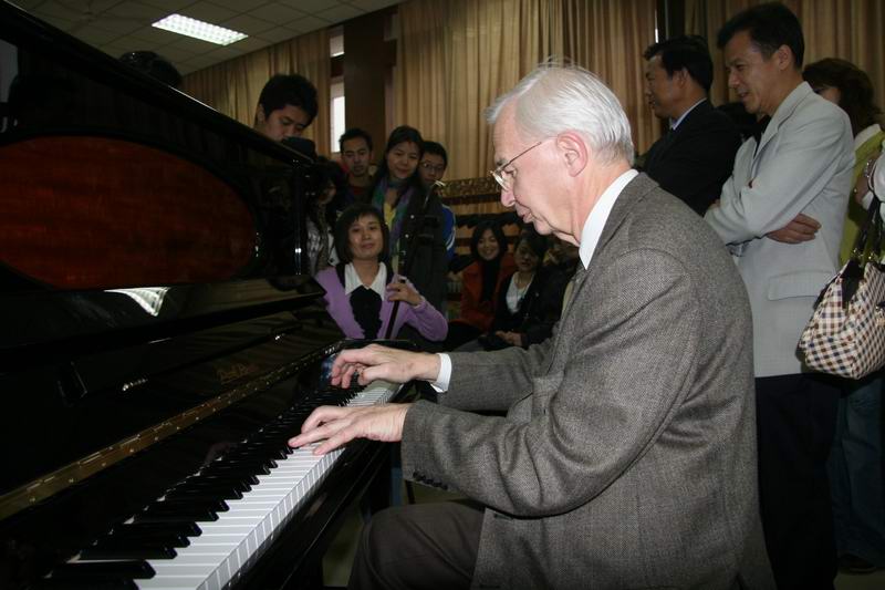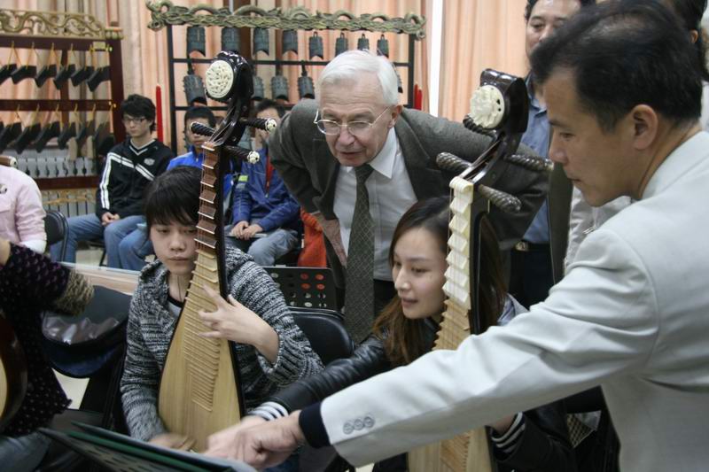 Jean-Marie Lehn院士不仅在国际化学领域上有着很高的知名度,并且在音乐方面也有着浓厚的兴趣。在学院领导的陪同下,Jean-Marie Lehn院士一行在一首《迎宾曲》的乐器演奏中走进学院民乐演奏厅,Jean-Marie Lehn院士兴致勃勃的对乐队演奏的乐器一一进行了询问,并饶有兴趣的敲击古乐“编钟”、“方响”等乐器,在张建祥副校长的邀请下,Jean-Marie Lehn院士弹奏钢琴与我集团民乐队合奏了我国著名乐曲《茉莉花》,Jean-Marie Lehn院士精湛的钢琴演奏及对乐感的领悟博得了在场师生的阵阵掌声和称赞。
